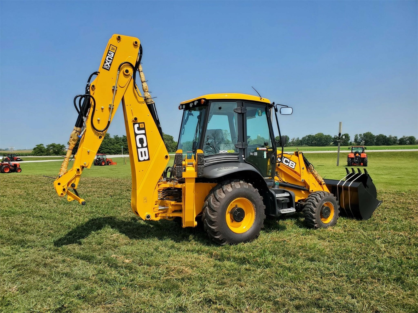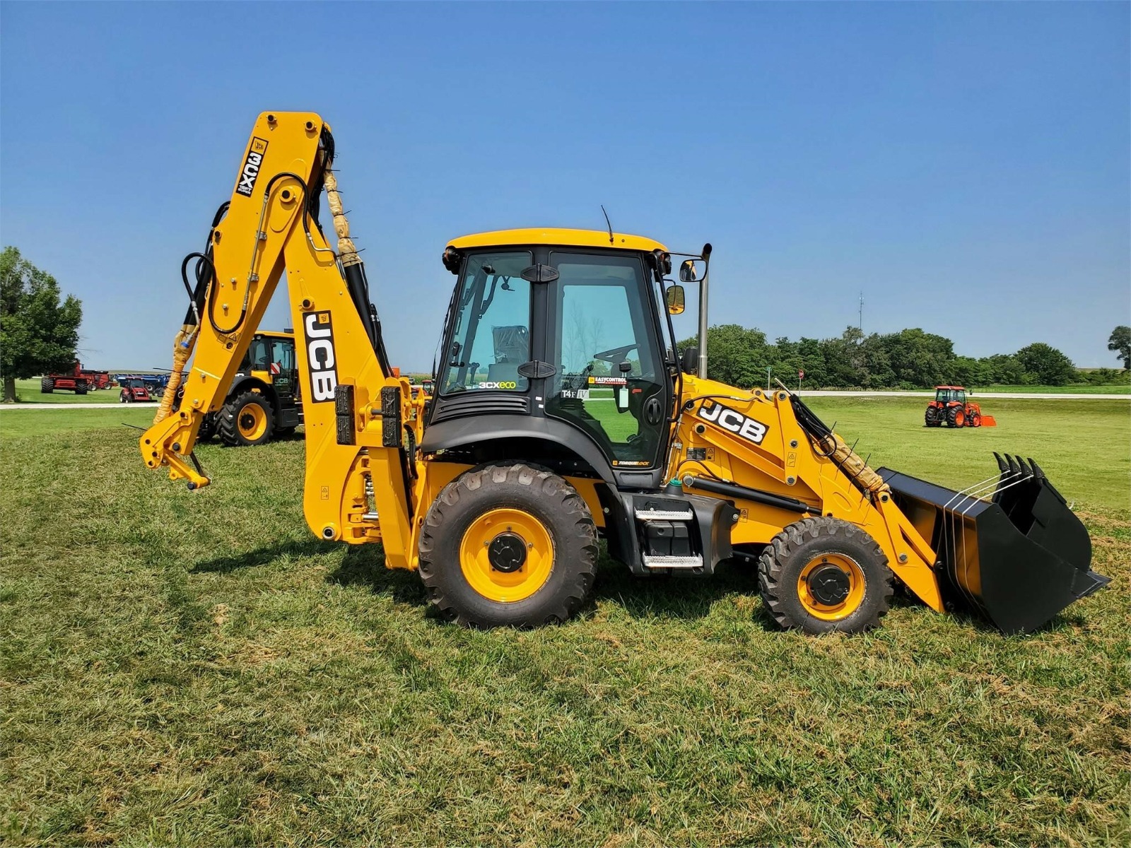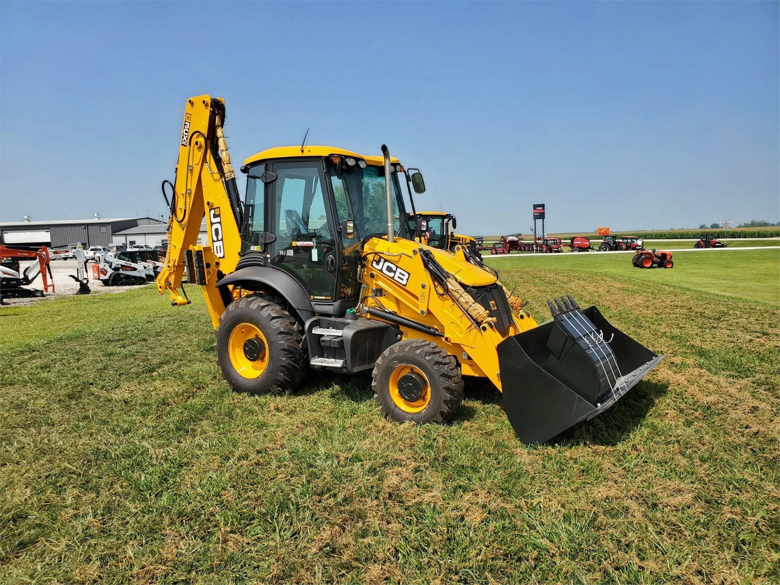 5/8 Loader Pipework with 92″ Front bucket with bolt on cutting edge, 24″ rear bucket, 110V Block Heater, Cab with LIVELINK, AC, Galaxy Industrial 14-17.5-10 and 19.5L-24-12 Tires. 4WD/2WS with Powershift Transmission, 15ft Center mount Backhoe with ExtraDig Extending Dipper, Front and rear working lights, Battery Isolator Toolbox, Telescopic Steering Wheel, English Territory Pack, Exterior Mirrors, Hammer/Bi-Directional Pipework