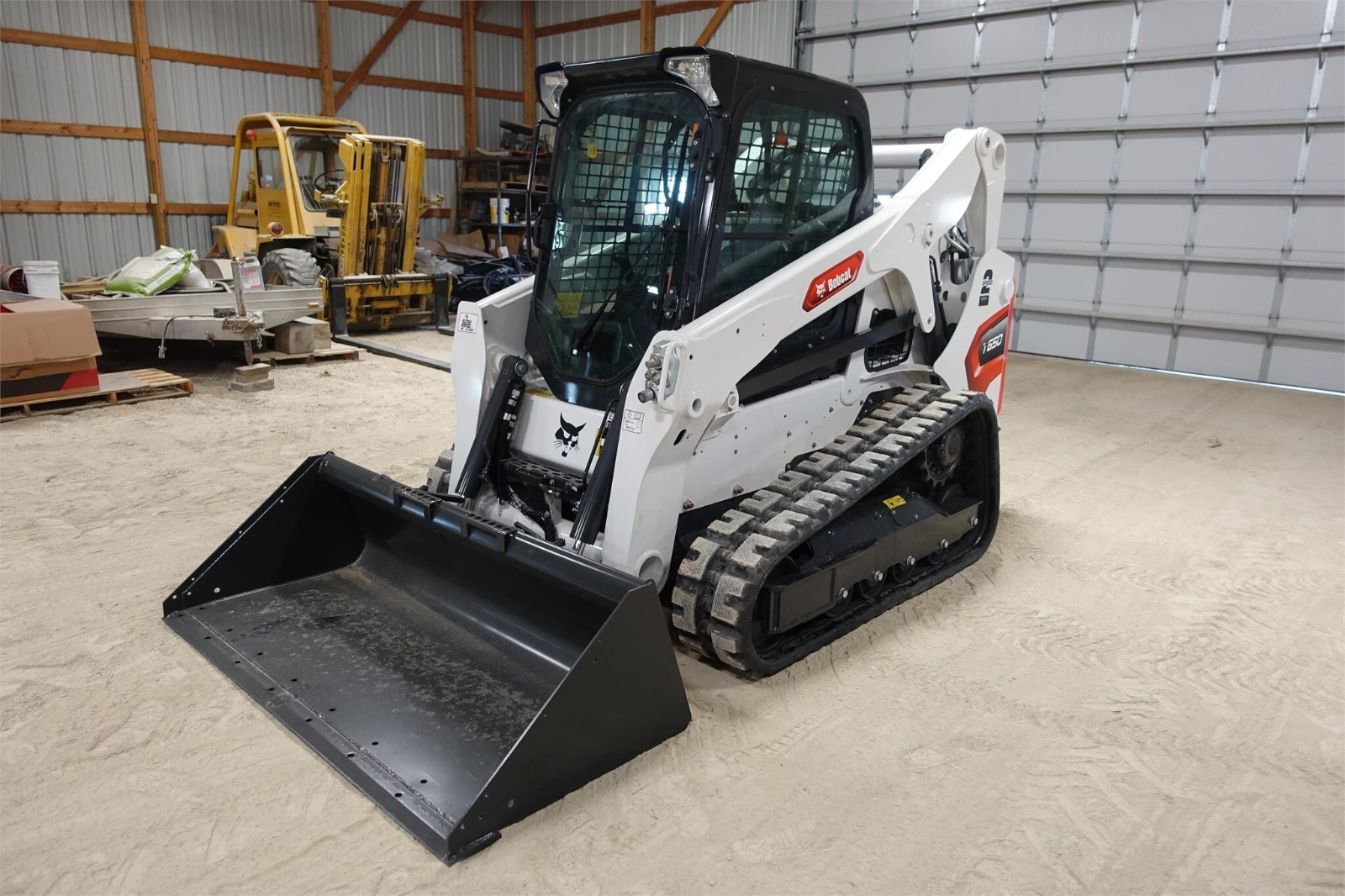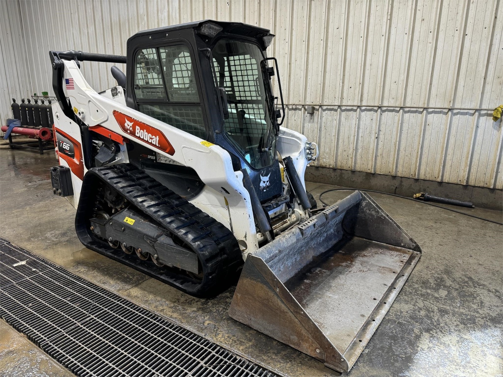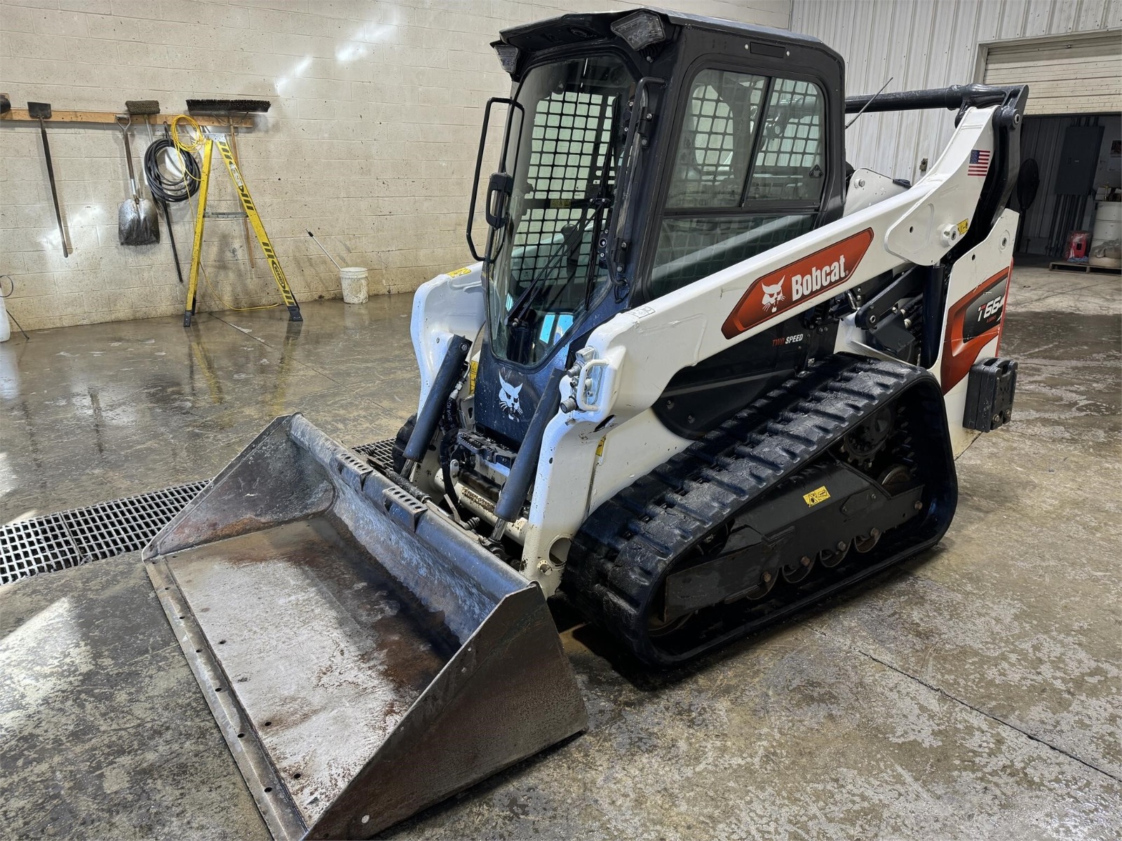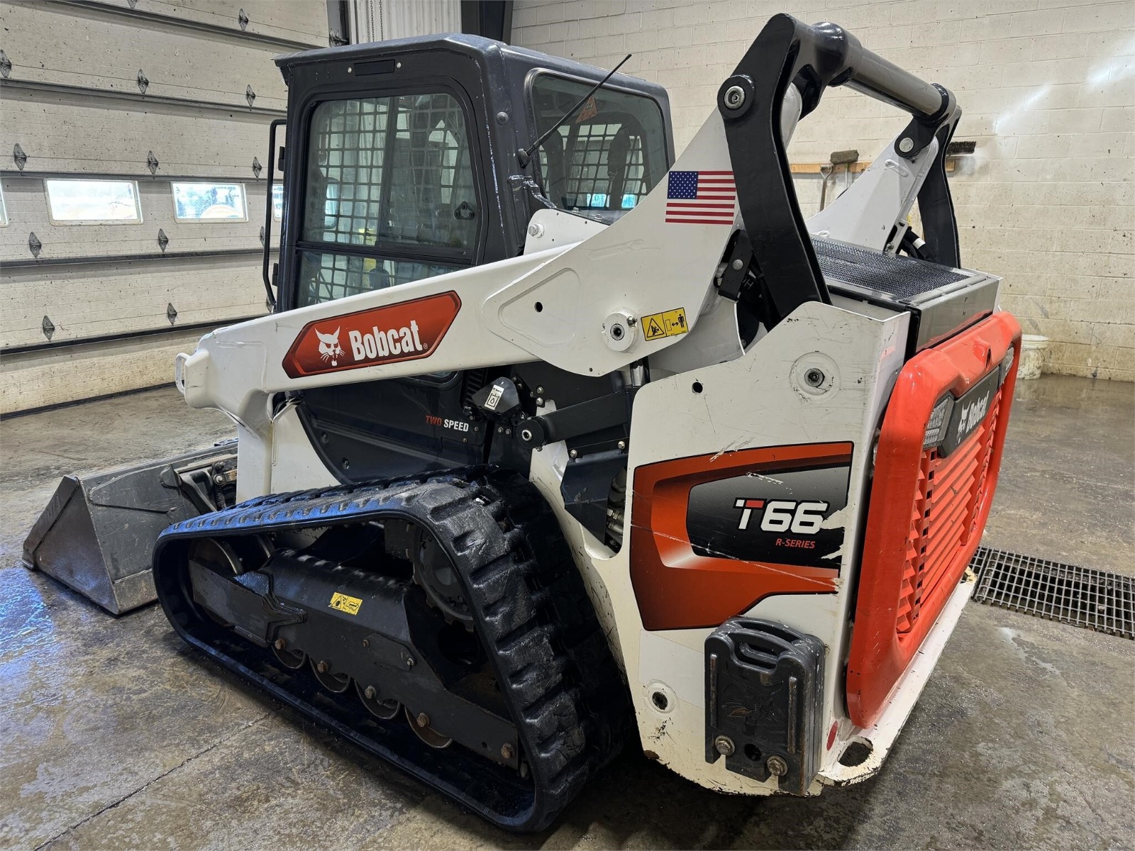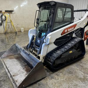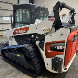 2020 Bobcat T66 skid loader with 882 hours. Features a 2-speed diesel engine delivering 74 horsepower, power bobtach, standard flow hydraulics, and a Bobcat 74″ bucket. Equipped with a cab and door for operator comfort.