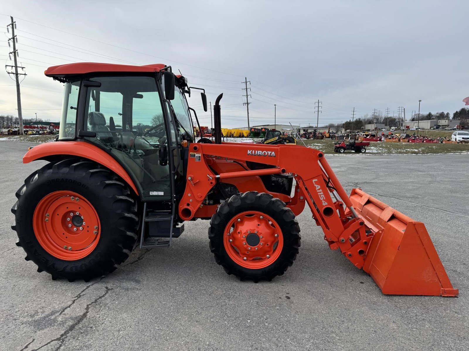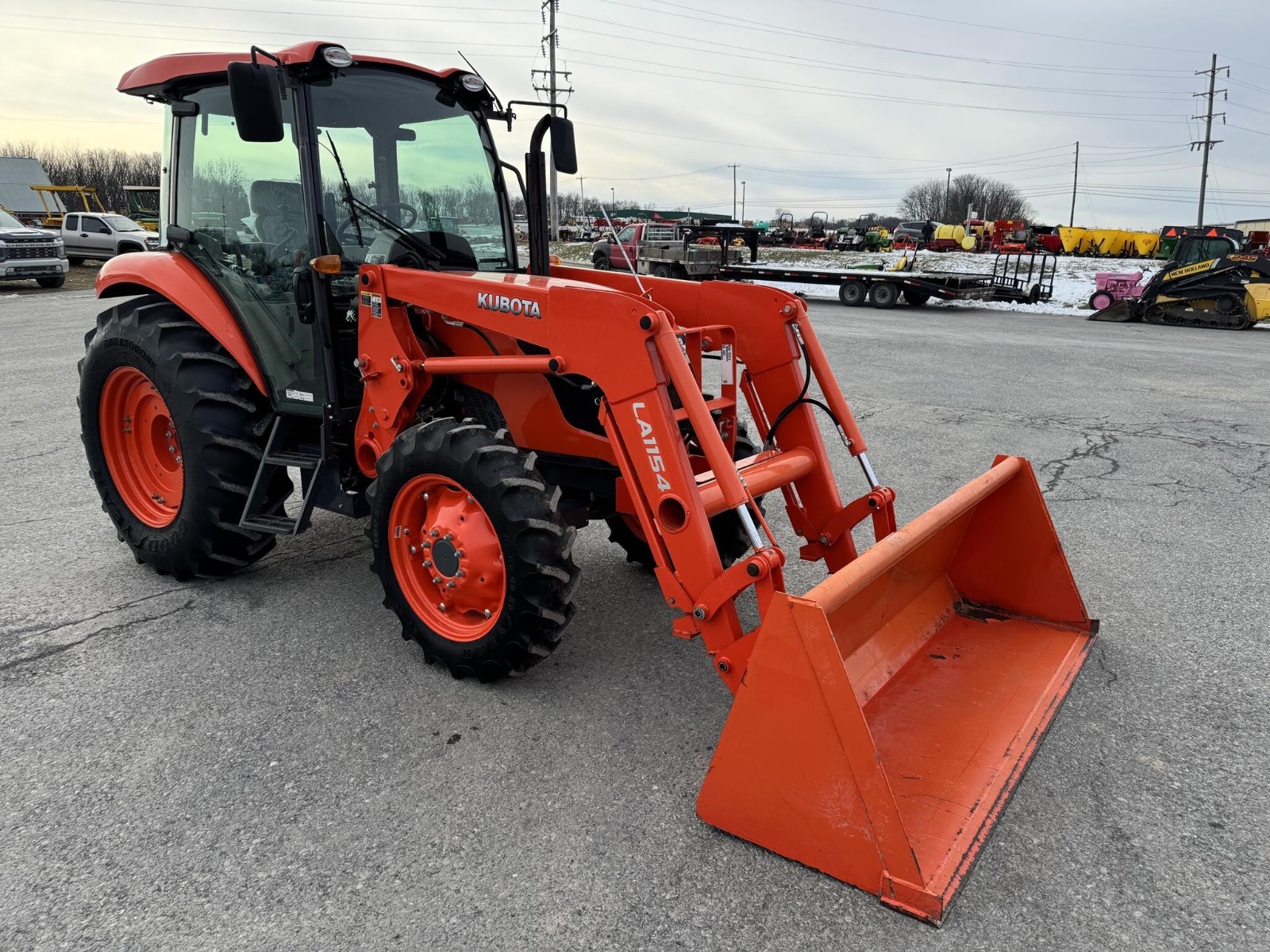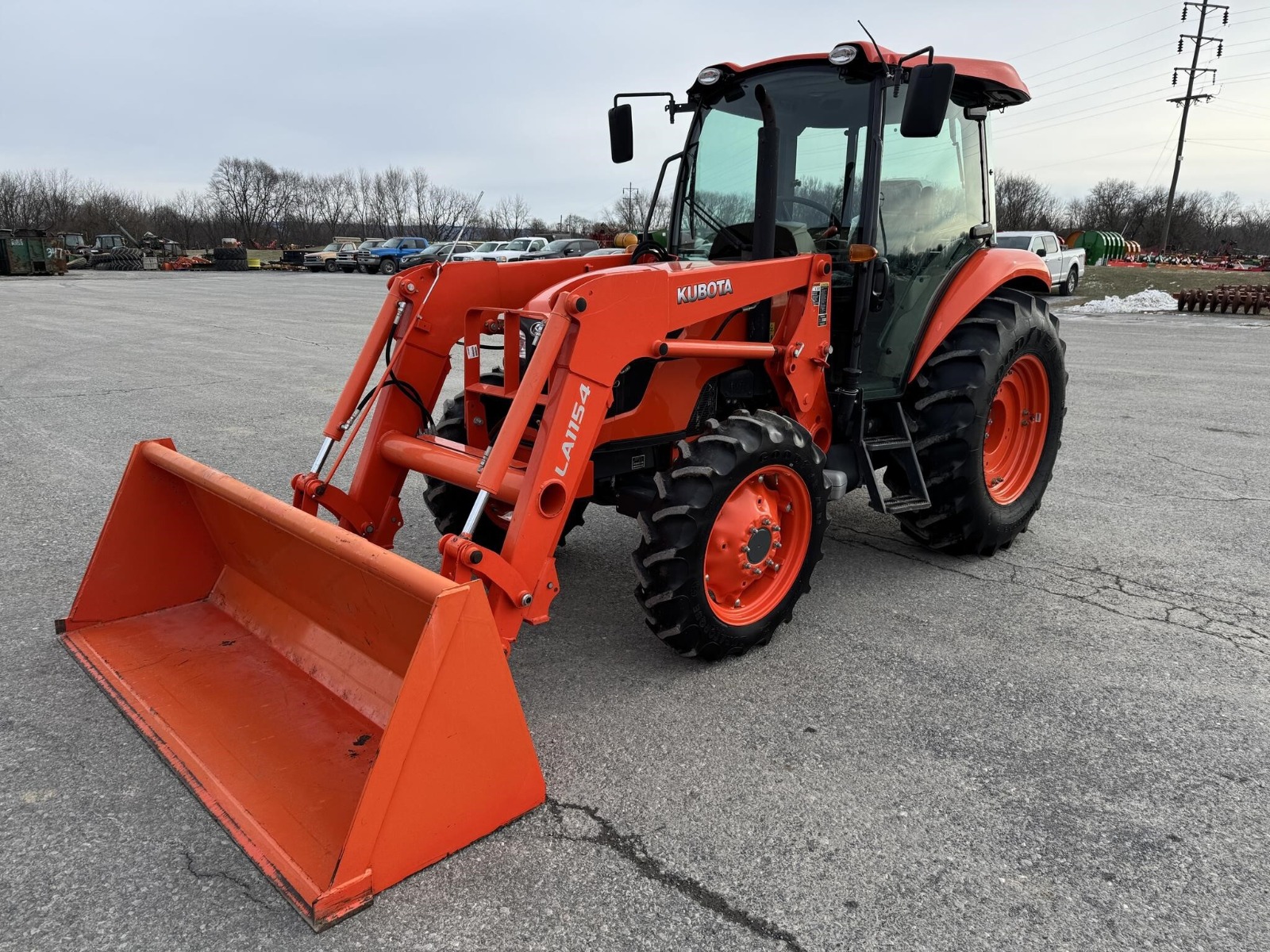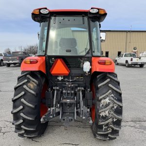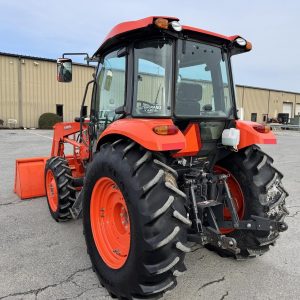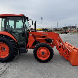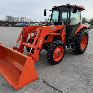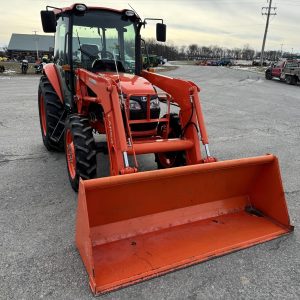 Kubota M7060 4×4 tractor with only 283 hours. This model features a 71-horsepower diesel engine paired with an 8-speed forward and reverse shuttle transmission and a left-hand reverser for efficient operation. It includes a factory cab, an LA1154 loader with a Bobtach bucket, and one set of remote outlets for implement versatility.